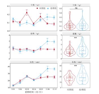 石墨烯光催化網(wǎng)的作用下,雖然苦草干重在處理組與對(duì)照組之間差異不顯著(P >0.05),但處理組苦草濕重和株長(zhǎng)均顯著增加(P<0.01;圖2)。相比于對(duì)照組,試驗(yàn)期間處理組苦草濕重和株長(zhǎng)分別增加了20%和15%,并且苦草濕重、株長(zhǎng),甚至干重在試驗(yàn)開始1個(gè)月后,增長(zhǎng)幅度更加明顯(圖2)。在石墨烯光催化功能材料的作用下,水體中溶解氧持續(xù)上升,TP有機(jī)污染物和葉綠素a濃度顯著下降,水體透明度和水環(huán)境質(zhì)量得到明顯改善。
