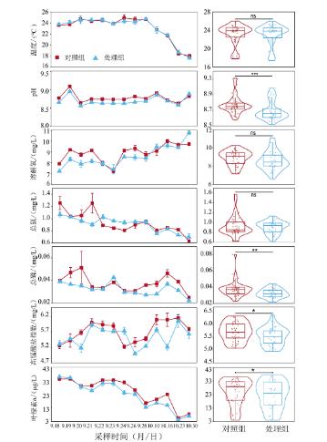 石墨烯光催化網(wǎng)對(duì)水質(zhì)的影響如圖1所示。處理組和對(duì)照組的水溫、溶解氧及總氮濃度差異不顯著,但處理組的pH(均值是8.69)顯著低于對(duì)照組(均值是8.77)(P< 0.001),表明石墨烯光催化網(wǎng)的使用可降低水體中的pH。這可能由于在光照的條件下,加速了空穴和電子與吸附在TiO2表面的OH-和O2的反應(yīng),使得水體中OH-大量消耗,導(dǎo)致pH降低。試驗(yàn)期間溶解氧整體呈上升趨勢(shì),一個(gè)月后達(dá)到最高點(diǎn)。