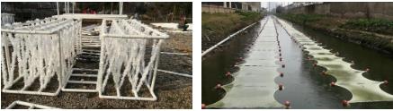 探索過程也并非是一帆風(fēng)順,經(jīng)歷了兩次失敗后,在第三次的方案調(diào)整中,他果斷摒棄了之前不銹鋼板固定PVC框的方式,首次采用了不銹鋼橡膠皮抱箍,將植物模塊放置在浮框中心,使得不銹鋼框架在水下“隱身”,在河道中2周左右能夠讓網(wǎng)穩(wěn)定在水下15cm左右的位置。新型布網(wǎng)方式的應(yīng)用,取消了原有浮球、配重的使用,這不僅有效降低了配件的使用成本,更使得敷網(wǎng)更加簡易化,減少了人工施工難度,大幅度提高了現(xiàn)場(chǎng)工作效率。