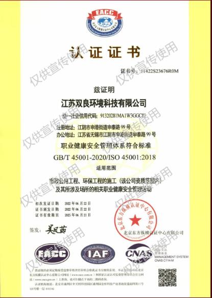 經(jīng)專業(yè)認(rèn)證機(jī)構(gòu)嚴(yán)格審核,2022年6月,江蘇雙良環(huán)境科技有限公司成功獲得ISO9001:2015 質(zhì)量管理、ISO14001:2015 環(huán)境管理、 ISO45001:2018 職業(yè)健康安全管理三大體系認(rèn)證。認(rèn)證范圍覆蓋市政公用工程、環(huán)保工程的施工。