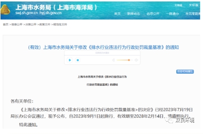上海市水務(wù)局決定,對(duì)《排水行業(yè)違法行為行政處罰裁量基準(zhǔn)》(滬水務(wù)規(guī)范〔2023〕3號(hào))中“一、向城鎮(zhèn)排水與污水處理設(shè)施傾倒施工泥漿等廢棄物”的行政處罰裁量基準(zhǔn)作如下修改:一、向城鎮(zhèn)排水與污水處理設(shè)施傾倒施工泥漿等廢棄物:案由:侵害排水設(shè)施適用:向城鎮(zhèn)排水與污水處理設(shè)施傾倒施工泥漿、垃圾、渣土等廢棄物。本決定自2023年9月1日起施行。