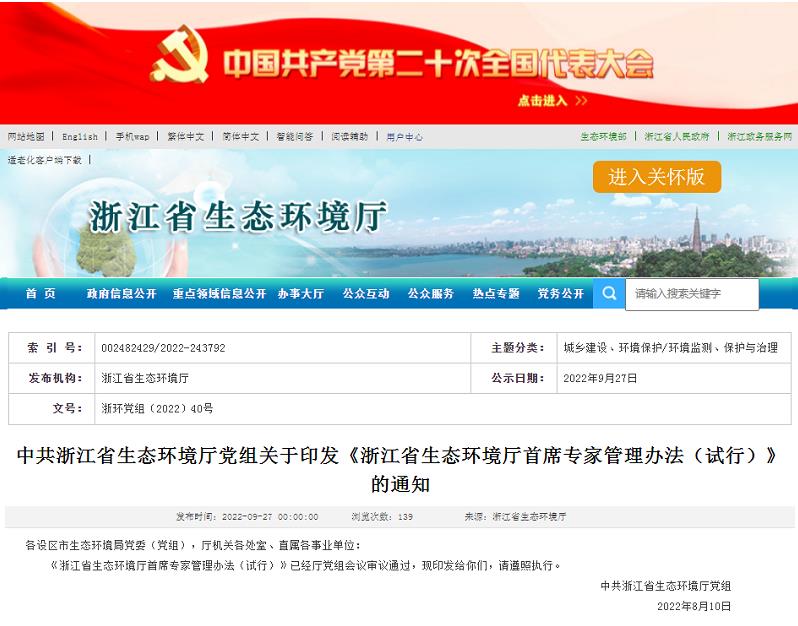 06中共浙江省生態(tài)環(huán)境廳黨組關(guān)于印發(fā)《浙江省生態(tài)環(huán)境廳首席專家管理辦法(試行)》的通知