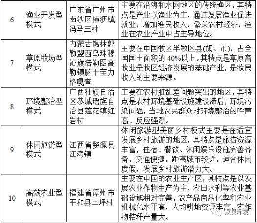 國(guó)家農(nóng)業(yè)部于2013年啟動(dòng)了“美麗鄉(xiāng)村”創(chuàng)建活動(dòng),于2014年2月正式對(duì)外發(fā)布美麗鄉(xiāng)村建設(shè)十大模式,為全國(guó)的美麗鄉(xiāng)村建設(shè)提供范本和借鑒。具體而言這十大模式分別為:產(chǎn)業(yè)發(fā)展型、生態(tài)保護(hù)型、城郊集約型、社會(huì)綜治型、文化傳承型、漁業(yè)開發(fā)型、草原牧場(chǎng)型、環(huán)境整治型、休閑旅游型、高效農(nóng)業(yè)型。
