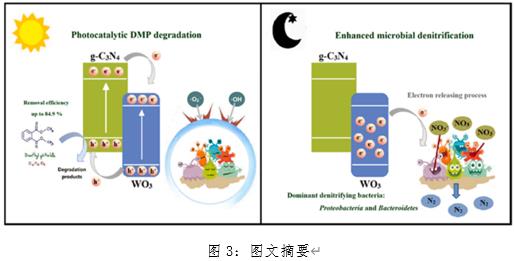 4記憶光催化劑與河流沉積物微生物群落的耦合體系,并將其應(yīng)用于鄰苯二甲酸二甲酯(DMP)和硝酸鹽的光/暗交替去除。SCMPM在光/暗循環(huán)(12/12h)下的性能表明,在光相期間,約84.90% 的DMP主要通過(guò)強(qiáng)烈的光催化氧化被去除,而在一個(gè)循環(huán)內(nèi)的暗相期間,通過(guò)存儲(chǔ)在WO
