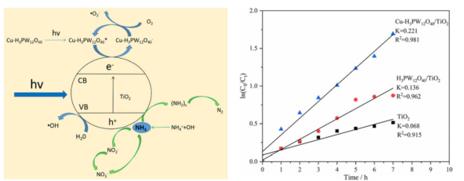 LvF新型光催化網(wǎng)_水庫治理_河道治理_水生態(tài)修復(fù)_水環(huán)境治理與修復(fù)_江蘇雙良環(huán)境科技有限公司圖4. 磷鎢酸銅/二氧化鈦復(fù)合材料處理氨氮原理及效果對(duì)比圖