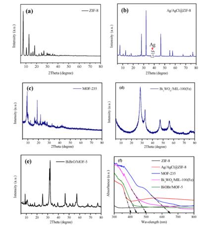 QZ2新型光催化網(wǎng)_水庫治理_河道治理_水生態(tài)修復_水環(huán)境治理與修復_江蘇雙良環(huán)境科技有限公司QZ2新型光催化網(wǎng)_水庫治理_河道治理_水生態(tài)修復_水環(huán)境治理與修復_江蘇雙良環(huán)境科技有限公司圖2.(a)ZIF-8,(b)Ag / AgCl @ ZIF-8,(c)MOF-235,(d)Bi2WO6/MIL-100(Fe),(e)BiOBr/MOF-5的XRD圖,和(f)光催化劑的UVevis圖。
