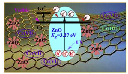 2吸附-脫附分析,對ZnO/石墨烯的結(jié)構(gòu)和組成進行了表征。Zn-O-C鍵的形成證明了材料合成成功。石墨烯的加入使ZnO半導體的帶隙略有縮小,在可見光范圍內(nèi)光吸收性能顯著增強。在可見光下,氧化鋅的光還原活性很好。NG作為電子載體促進了光生載流子的分離,從而提高了ZnO/石墨烯的光活性。在紫外光照射下,帶隙激發(fā)的ZnO和激發(fā)態(tài)的石墨烯共同參與了Cr(VI)的光還原,而在可見光下,激發(fā)態(tài)石墨烯注入到ZnO的CB中的電子是其光活性的來源。光腐蝕抑制也得到了證實。本工作為以天然氣為原料制備氧化鋅/石墨烯納米雜化材料提供了一種簡單實用的方法。納米雜化物在水污染修復中表現(xiàn)出高效、穩(wěn)定的光催化性能。