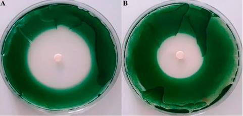 QZ2新型光催化網(wǎng)_水庫治理_河道治理_水生態(tài)修復_水環(huán)境治理與修復_江蘇雙良環(huán)境科技有限公司圖1 活性被測海藻精油在固體培養(yǎng)基上對銅綠假單胞菌的抗藍藻活性。(A) 歐囊鏈藻;(B)鈍馬尾藻