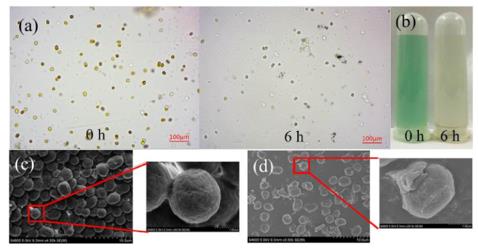QZ2新型光催化網(wǎng)_水庫治理_河道治理_水生態(tài)修復_水環(huán)境治理與修復_江蘇雙良環(huán)境科技有限公司圖4. Ag / AgCl @ ZIF-8對銅綠微囊藻形態(tài)的影響:(a)放大倍數(shù)為40×的顯微鏡圖像,(b)藻類溶液的照片以及未處理(c)和處理過的(d)藻類細胞的SEM圖像