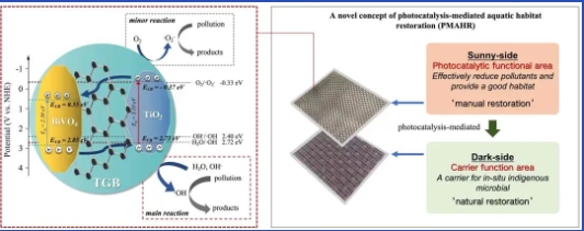 本文首次提出了光催化介導(dǎo)原位水生境修復(fù)(PMAHR)的新概念。設(shè)計(jì)了具有雙功能結(jié)構(gòu)的原位水生境修復(fù)織物器件。通過逐步提高水生生物棲息地的質(zhì)量,間接為水生生物創(chuàng)造良好的生存條件促進(jìn)其生長,從而提高水生生物多樣性。研究通過水熱方式合成了一種PMAHR材料TiO2 / Graphene / BiVO4 (TGB)。表征數(shù)據(jù)表明新材料的吸收波長拓展至 504 nm。進(jìn)一步地,聯(lián)合團(tuán)隊(duì)設(shè)計(jì)了一種基于TGB材料和原位微生物分區(qū)固定化的雙功能結(jié)構(gòu)PMAHRM器件。器件向陽面通過噴霧工藝涂布TGB材料,而背面則設(shè)計(jì)用于富集水中的原位微生物的功能。兩個(gè)部分通過特殊導(dǎo)線實(shí)現(xiàn)了連接。該器件在可見光下對RhB的去除率為 85.70 %。將該器件與輪葉狐尾藻( Myriophyllum verticillatum )相結(jié)合,在無錫某處黑臭水體進(jìn)行了為期近6個(gè)月的現(xiàn)場試驗(yàn)。結(jié)果表明,NH3-N、TP和COD濃度指標(biāo)降幅明顯,分別為 85.96 %、77.78 %和 73.53 %;透明指數(shù)上升 3.3 倍;底泥TN、TP和OM濃度指標(biāo)分別降低了 10.64 %、9.60 %和 34.08 %。生境質(zhì)量提進(jìn)而升產(chǎn)生了積極的生物效應(yīng)。其中,浮游生物和底棲動物的Shannon-Wiener多樣性指數(shù)增加。藍(lán)藻門的密度下降了 57.33 %,綠藻門和硅藻門的出現(xiàn)使藻相趨于平衡。浮游動物的平均密度增加了 5 倍。PMAHRM器件利用新型TGB納米復(fù)合材料,在水生境恢復(fù)中發(fā)揮了重要作用,有效促進(jìn)了水體生物多樣性的提升。