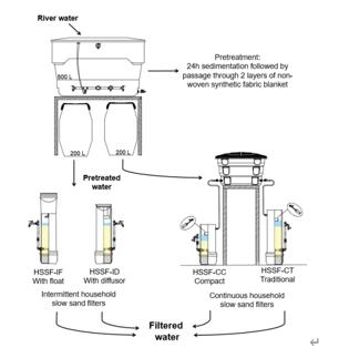 W5A新型光催化網(wǎng)_水庫治理_河道治理_水生態(tài)修復(fù)_水環(huán)境治理與修復(fù)_江蘇雙良環(huán)境科技有限公司本研究旨在評(píng)估四種家用慢砂過濾器(HSSF)模型在其整個(gè)生物層發(fā)育過程中去除河水中微生物的效率。兩種模型設(shè)計(jì)為連續(xù)運(yùn)行(HSSF-CC和HSSF-CT),兩種模型設(shè)計(jì)為間歇運(yùn)行(HSSF-ID和HSSF-IF)。每天給過濾器注入48 L預(yù)處理過的河水(24小時(shí)沉淀,然后通過無紡布合成毯過濾)。水樣通過大腸菌群細(xì)菌進(jìn)行定量,用明亮視野顯微鏡觀察微生物。大腸菌群總減少量在1.42±0.59 log和2.96±0.58 log之間,連續(xù)模型表現(xiàn)出更好的性能(p值< 0.004)。HSSF-IF、HSSF-CC和HSSF-CT的大腸桿菌減少量在1.49±0.58 log到2.09±0.66 log之間,HSSF-IF、HSSF-CC和HSSF-CT表現(xiàn)相似(p值> 0.06),略優(yōu)于HSSF-ID (p值=0.04)。用顯微鏡在原水和預(yù)處理過的水中檢測(cè)藻類、原生動(dòng)物和蠕蟲等微生物。藻類是這些樣本中最顯著的一組,盡管它們?cè)谶^濾水中沒有被明亮視野顯微鏡觀察到。結(jié)果表明,HSSF具有降低河流水微生物風(fēng)險(xiǎn)的潛力,從而增加了農(nóng)村社區(qū)使用地點(diǎn)水處理的范圍。但是,必須對(duì)HSSF生物層進(jìn)行進(jìn)一步的研究。