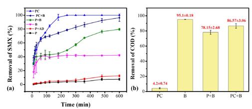 3JQ新型光催化網(wǎng)_水庫治理_河道治理_水生態(tài)修復(fù)_水環(huán)境治理與修復(fù)_江蘇雙良環(huán)境科技有限公司圖3 采用不同的處理方法(a)SMX和(b)COD的去除去除效果。P:僅LED光的光解;P+AD:LED的光解和原始載體的吸附,B:生物載體的生物降解,P+B:LED燈的光解和生物降解;PC:僅光催化,PC+B:光催化和生物降解。數(shù)值表示為平均值±標(biāo)準(zhǔn)偏差(SD)。