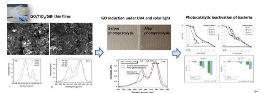 2/聚硅氧烷(SiBi)薄膜。通過掃描電子顯微鏡(SEM)、透射電子顯微鏡(TEM)、X射線光電子能譜(XPS)、紫外光電子能譜(UPS)、拉曼光譜和水接觸角測量對制備的涂層進行了表征。在光催化試驗中,觀察到用GO改性的所制備的涂層的顏色發(fā)生了強烈的變化。光催化試驗后薄膜的XPS分析表明GO發(fā)生了還原。研究了制備的涂層在UVA和自然陽光照射下對水產養(yǎng)殖水中自然產生的微生物的滅活作用。在UVA照射下,研究了所制備涂層中rGO濃度對靶菌嗜水氣單胞菌和吉列檸檬酸桿菌滅活的影響。與吉列檸檬酸桿菌相比,嗜水氣單胞菌對光催化滅活更敏感。rGO濃度為1%和5%的薄膜對目標微生物有較高的光催化滅活作用。進一步測試了rGO/TiO