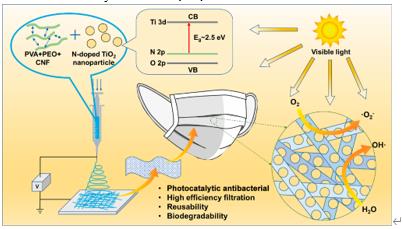9Zm新型光催化網(wǎng)_水庫治理_河道治理_水生態(tài)修復_水環(huán)境治理與修復_江蘇雙良環(huán)境科技有限公司在災難性的SARS-CoV-2(2019冠狀病毒疾?。┐罅餍衅陂g,美國疾病控制和預防中心強烈建議使用個人防護裝備(PPE)進行自我保護。然而,個人防護用品的大規(guī)模使用在回收和消毒使用過的口罩方面遇到了重大挑戰(zhàn)。為了解決舊口罩的相關塑料污染問題,在這項工作中,我們設計了一種可重復使用、可生物降解和抗菌的口罩。通過聚乙烯醇(PVA)、聚環(huán)氧乙烷(PEO)和纖維素納米纖維(CNF)的靜電紡絲,然后酯化和沉積氮摻雜的TiO
