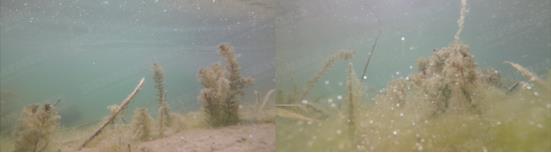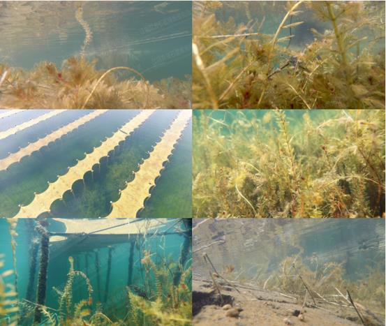 T1池:水下通透、自然生長(zhǎng)的狐尾藻、蘿卜螺。